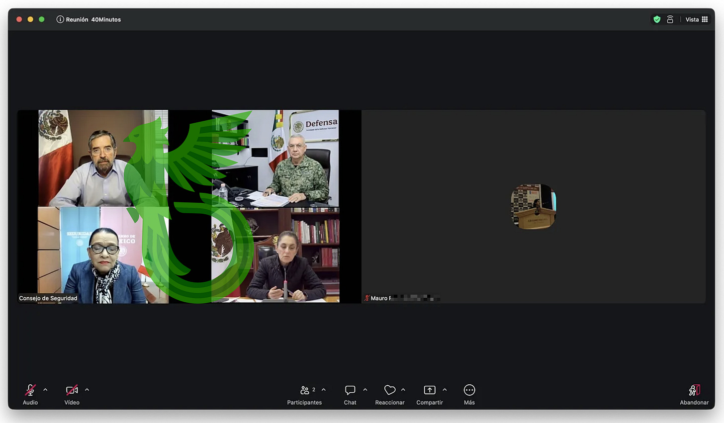 But as soon as I joined, the caller’s webcam activated automatically and began playing a deepfaked video showing Mexican President Claudia Sheinbaum, General Trevilla Trejo, and other cabinet members in what appeared to be an emergency meeting (translation below).