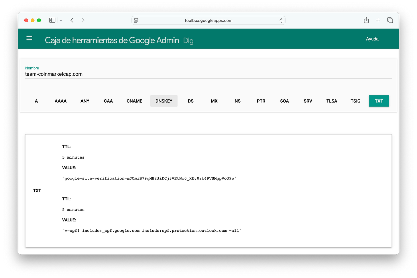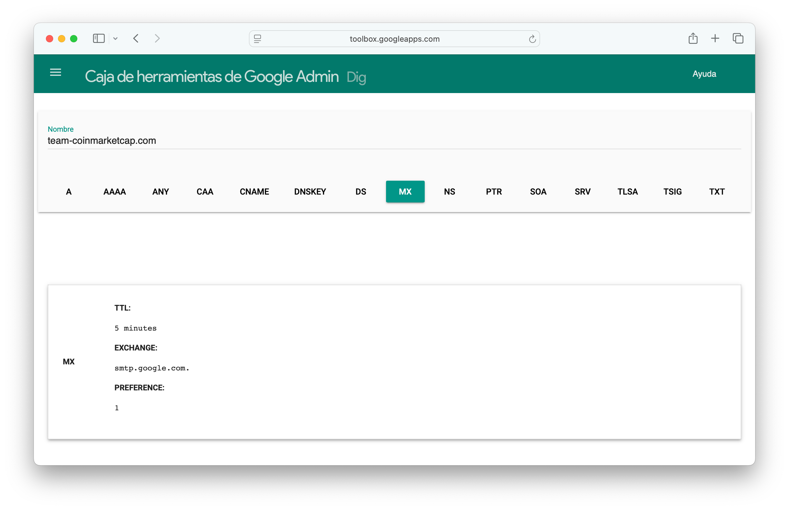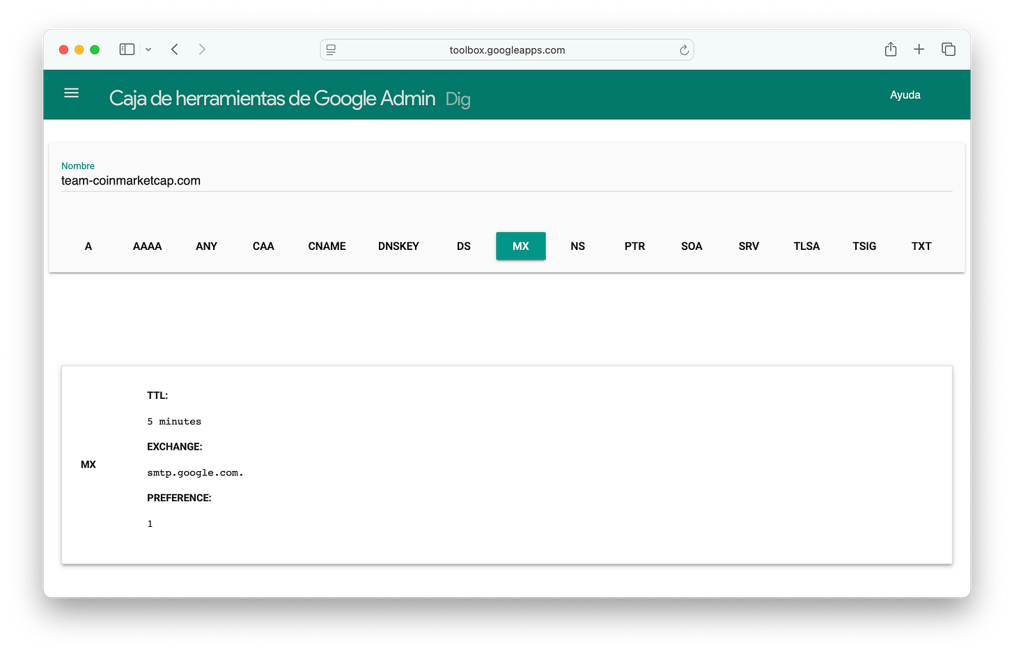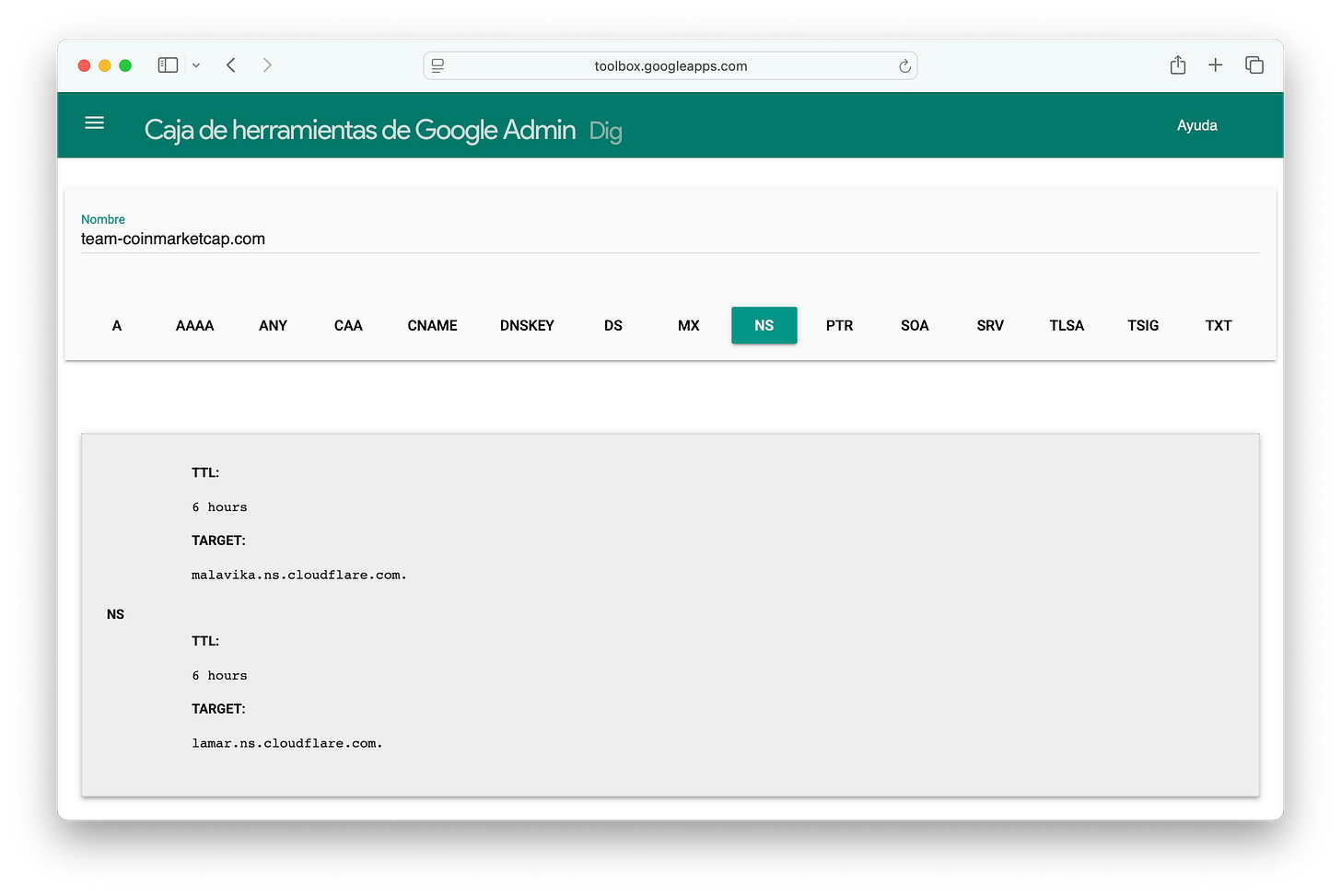 Using Google’s Toolbox, we can run dig online.