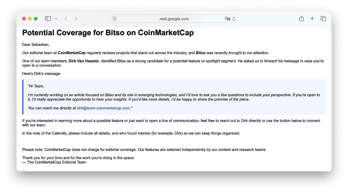 It all started with an email from someone claiming to work at CoinMarketCap’s editorial team, wanting to write an article about our company.