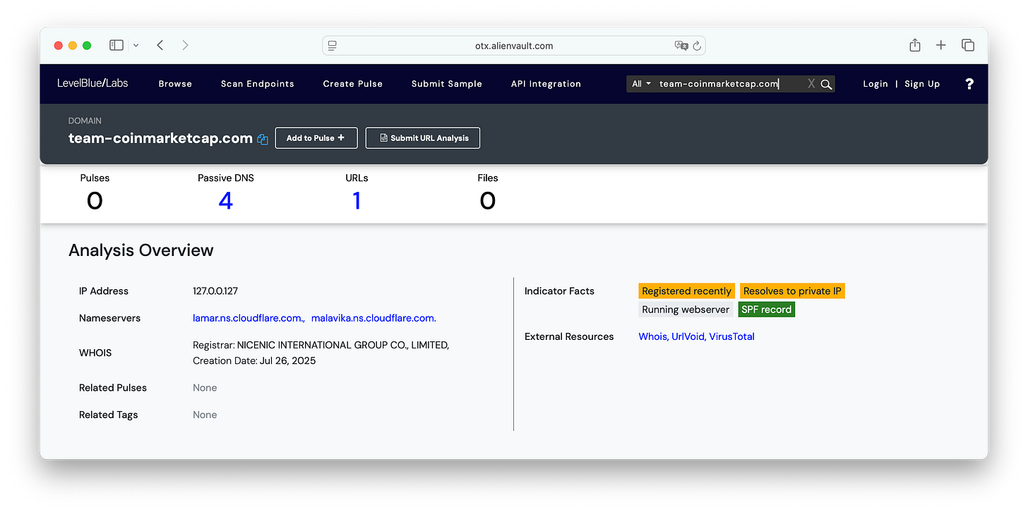 The first thing we noticed was the fake domain: team-coinmarketcap[.]com