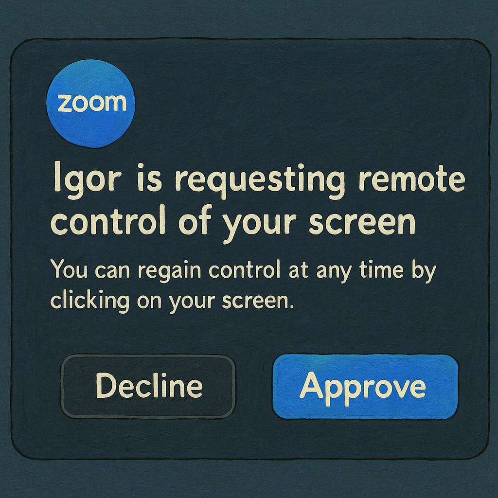 In reality, the window was a notification that a remote participant wanted to take control of my screen (a standard Zoom feature). It did include a warning about the associated risks and permissions… but all of it was written in Polish.