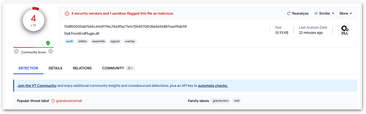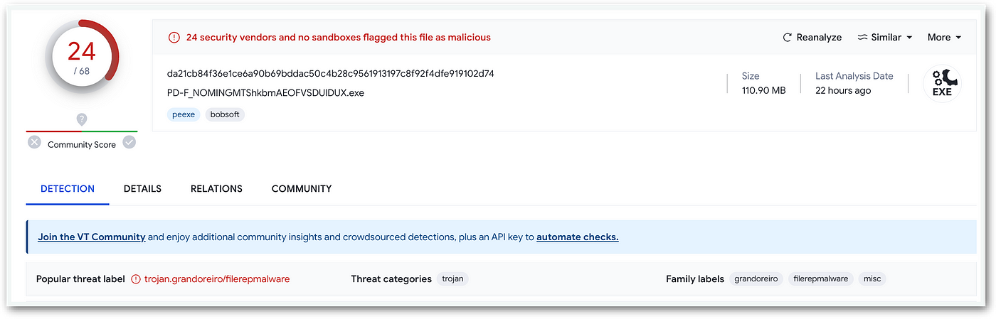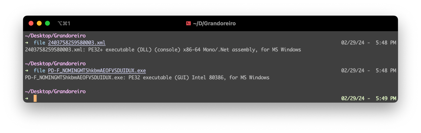 A quick analysis of both files pointed fingers to a usual suspect on the Banking Trojans Scene: Grandoreiro, a family which recently faced an important takedown of part of their infrastructure at hands of Law Enforcement, and whose shenanigans are well known, documented and even fought back.