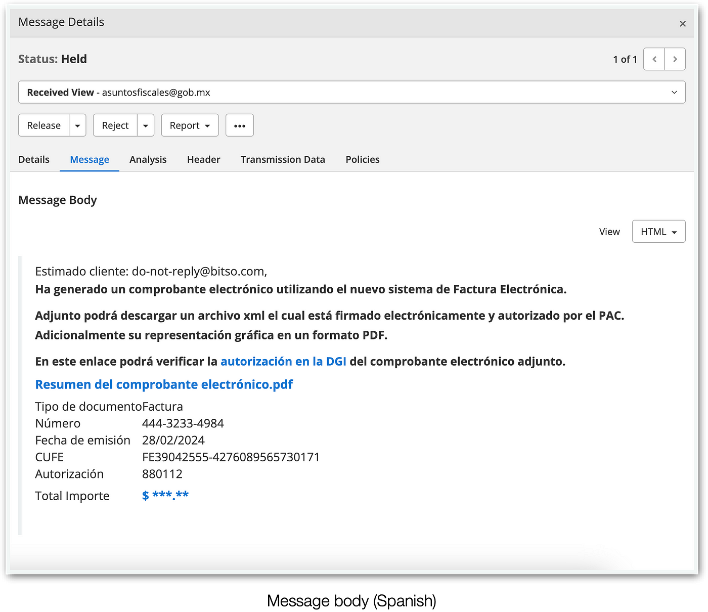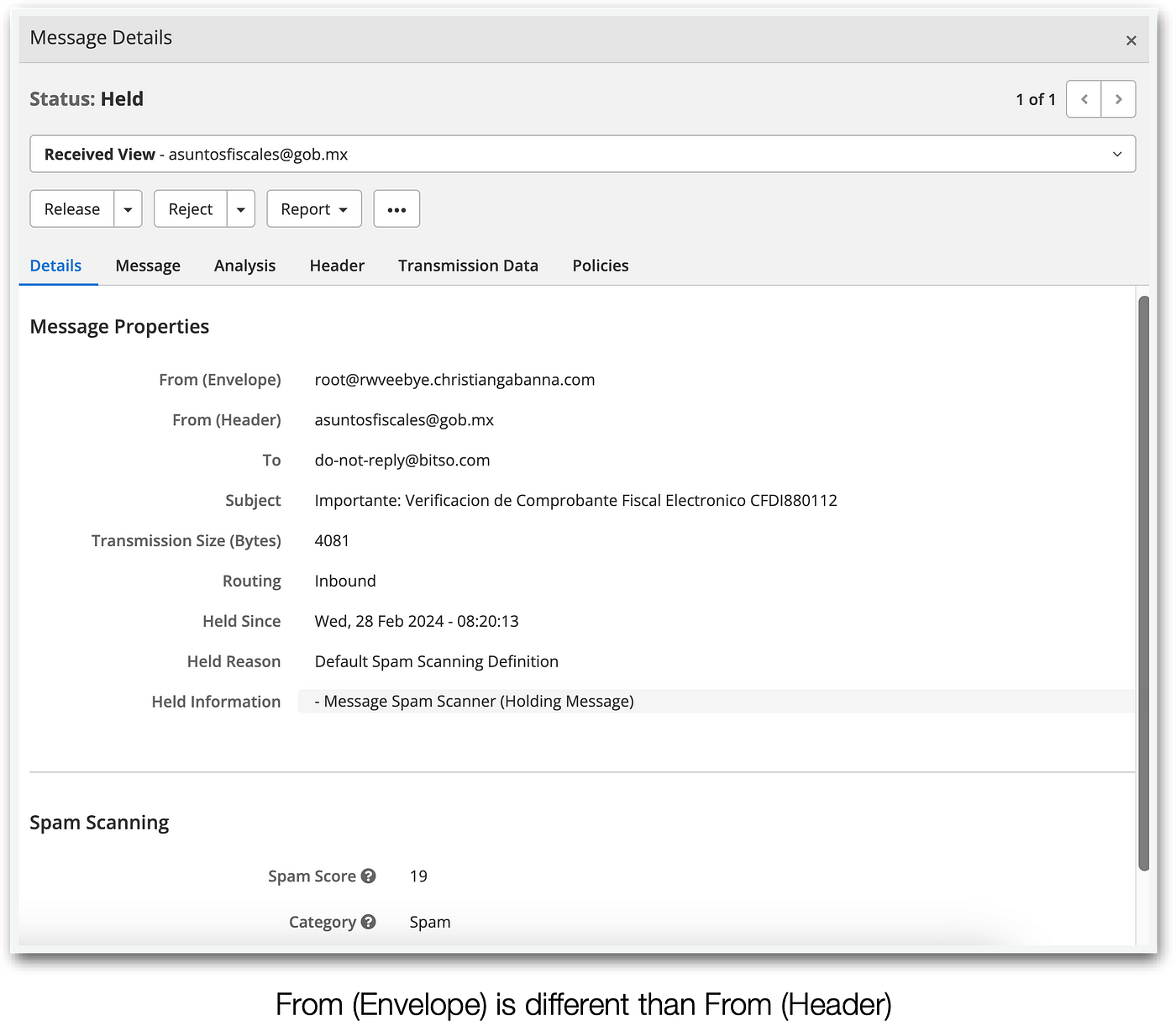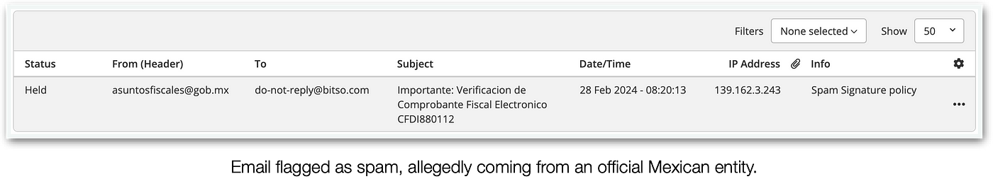 Why would an “official” email with an important-looking subject like “Important: Electronic Fiscal Invoice CFDI […] Verification” end up in the spam folder, alongside unsolicited vendors, romance scammers, and foreign princes searching for their next of kin? Well, let’s give it a closer inspection.