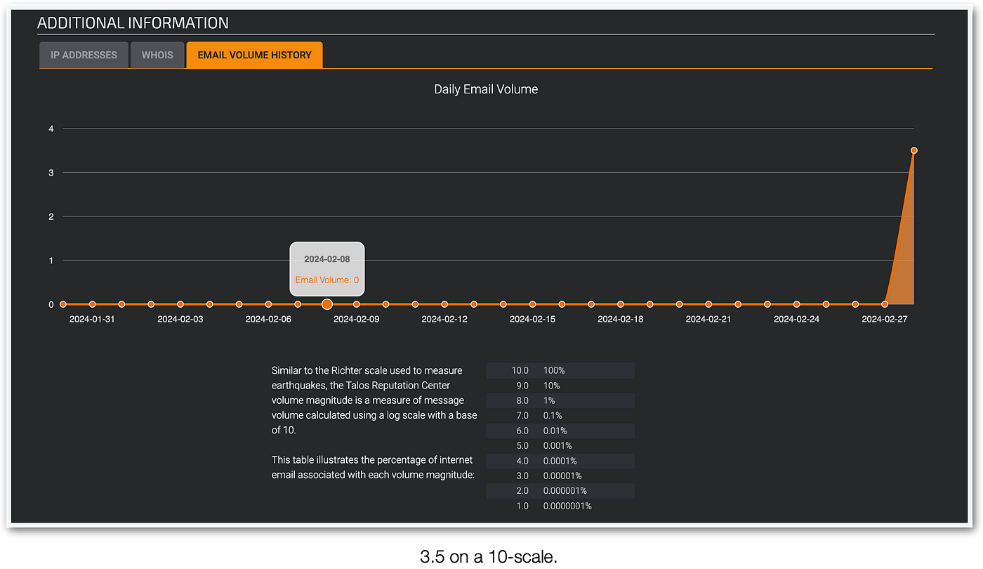 But what about their distribution domain? And I’m not talking about DropBox. The TA behind this effort used Azure to distribute the sample (URL available in the IOCs section). A quick look at its reputation and email volume on Cisco Talos tells us that it had a recent spike in its activity, marking that an active campaign took place after the “takedown” and is not residual activity.
