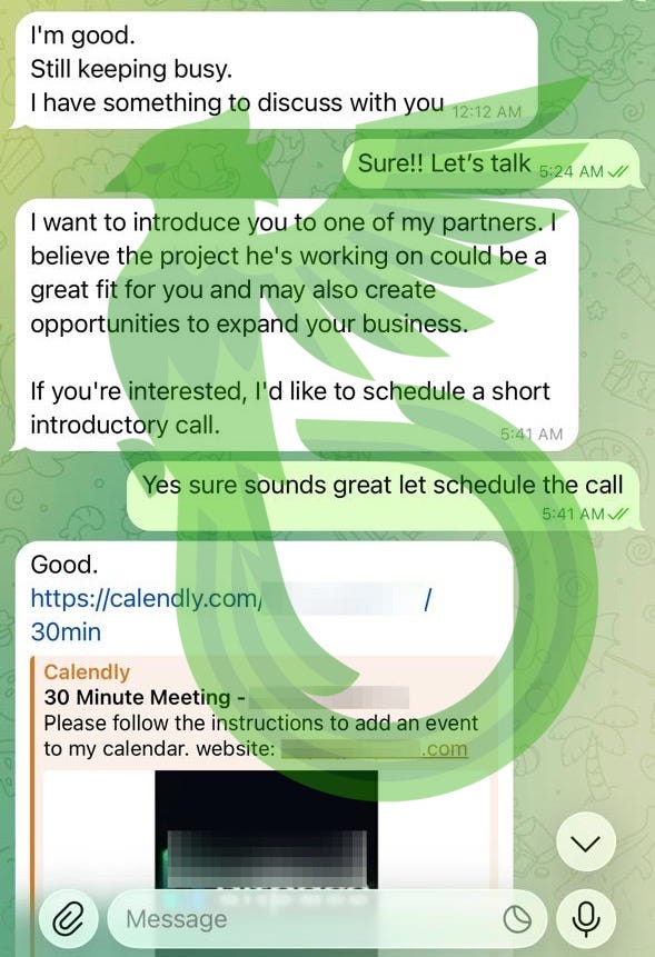 The ruse starts with an old trick. They hijack the Telegram account of someone in the Web3 or crypto space and invite their contacts to a meeting on a website impersonating a legitimate platform like Teams, Meet, or Zoom.