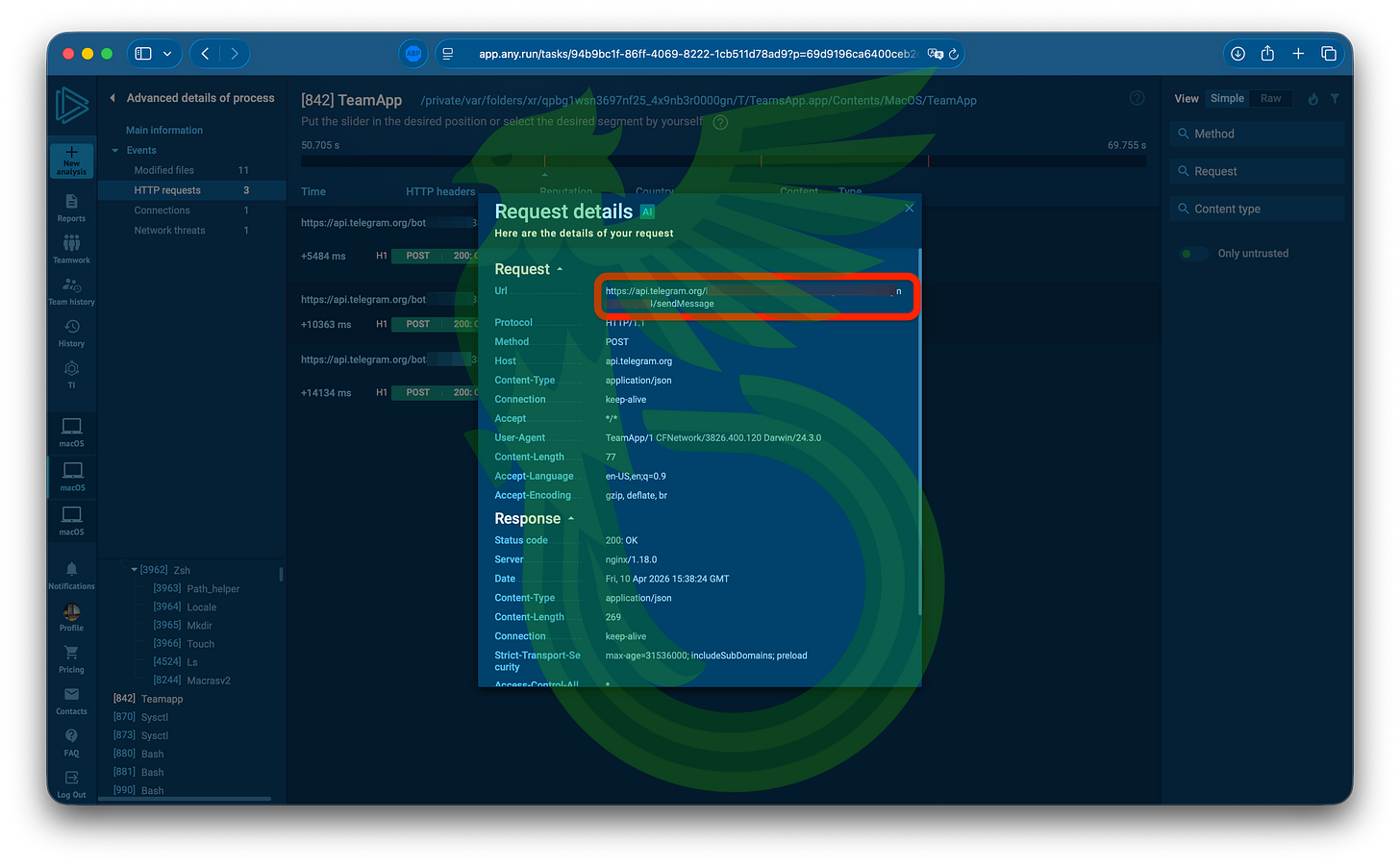 But it doesn’t end there. A payload called macrasv2 is downloaded next, acting as stealer targeting browser extension data, stored browser credentials and cookies, macOS Keychain entries, and other files of interest, and exfiltrating them via Telegram in an interesting and insecure way.